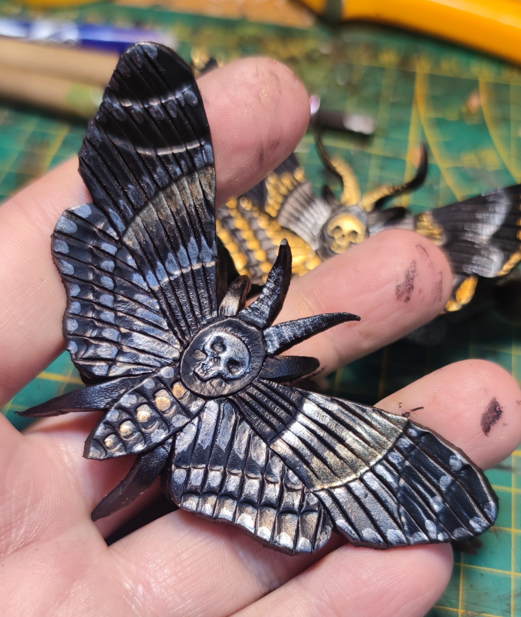 Spinka wykonywana jest ręcznie z naturalnej skóry garbowanej roślinnie. Każdy egzemplarz powstaje indywidualnie — faktura skóry, drobne różnice w odcieniu i ręczne wykończenie sprawiają, że każda ćma jest unikatowa.
