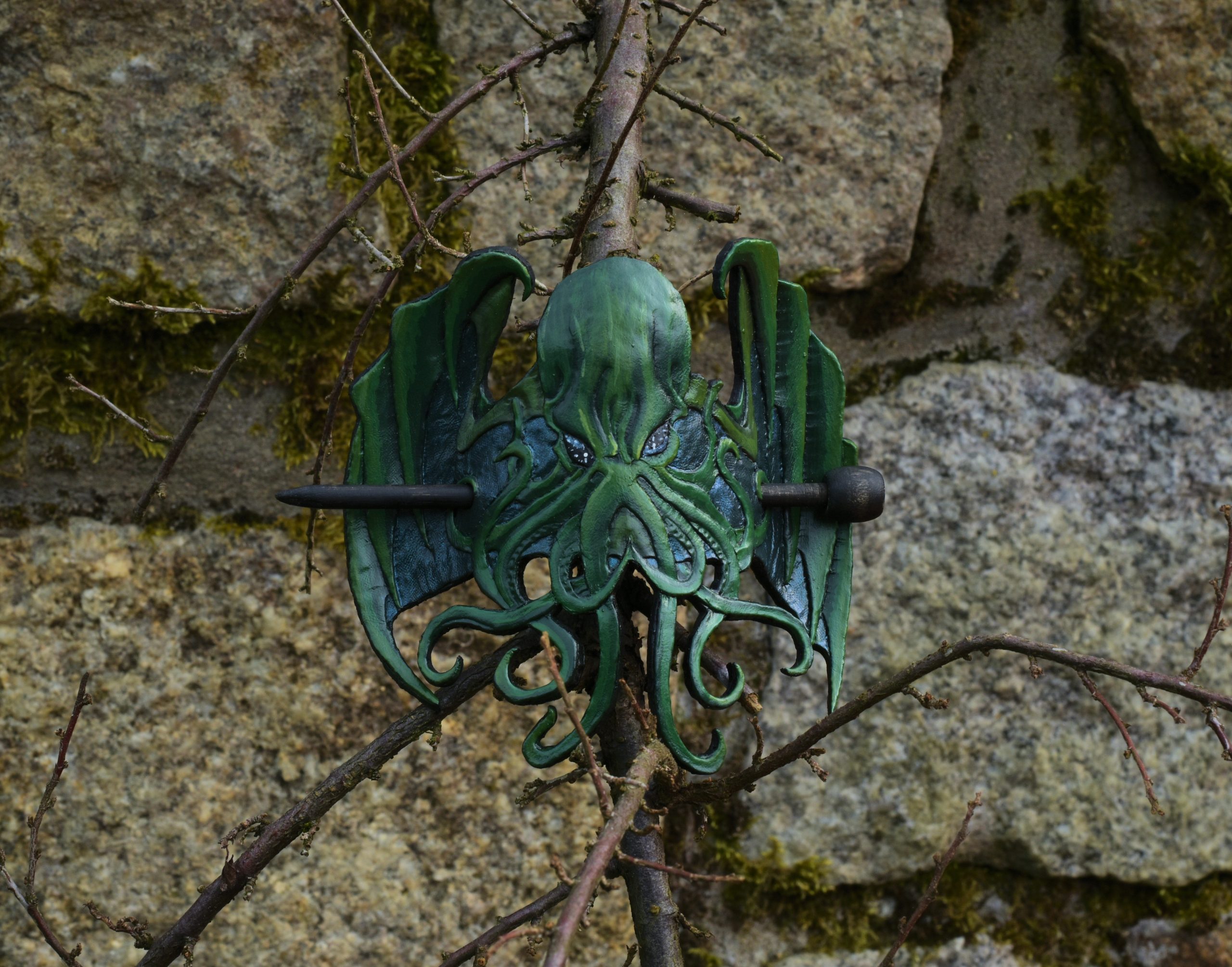 W 2towers Cthulhu powstaje wyłącznie ręcznie, z naturalnej skóry garbowanej roślinnie. Każdy egzemplarz ma własny charakter: faktura skóry, odcienie i drobne różnice w wykończeniu sprawiają, że nie istnieją dwa identyczne Cthulhu. To nie jest ozdoba masowa — to artefakt, który żyje własnym rytmem, jak pradawna opowieść o mocy i chaosie.