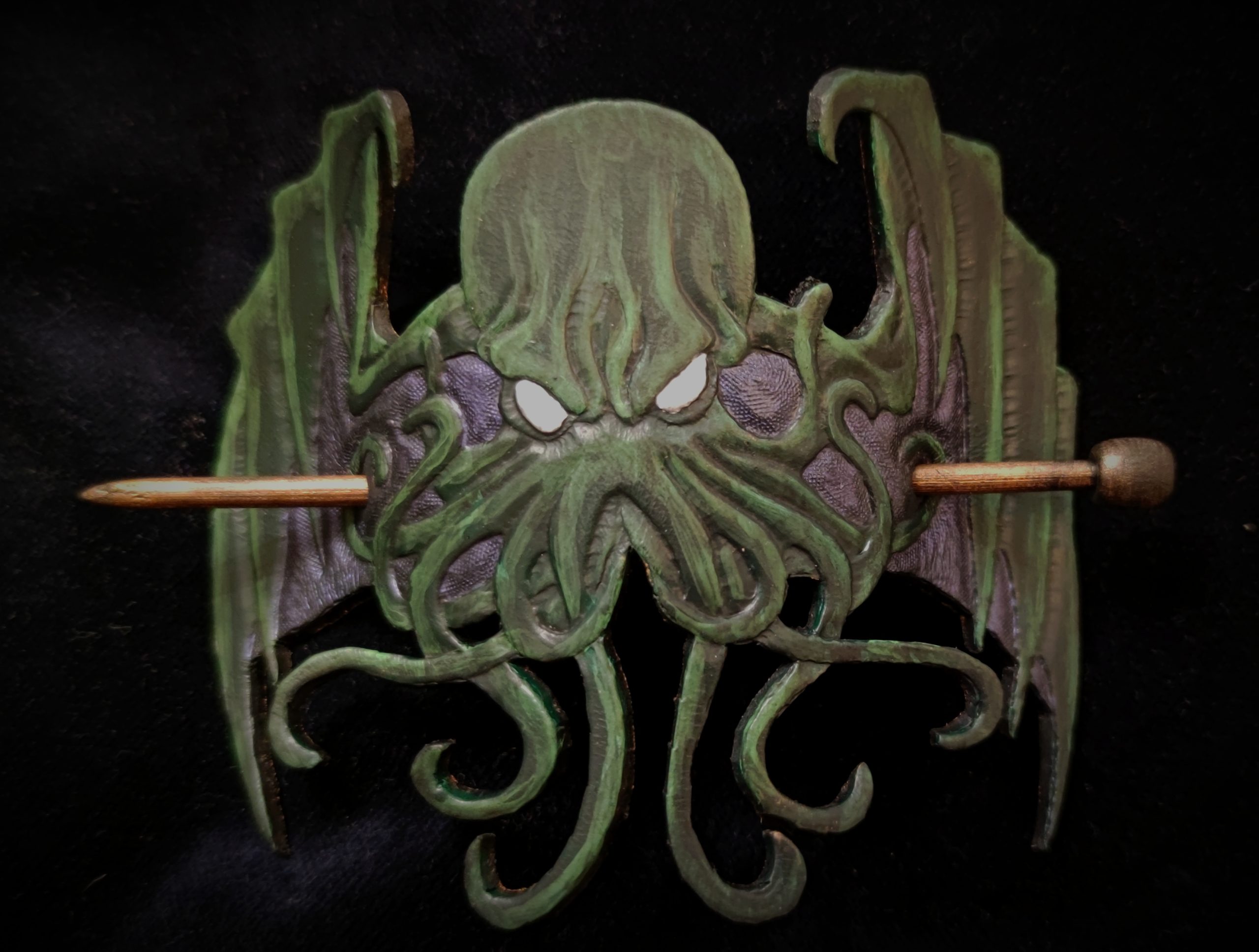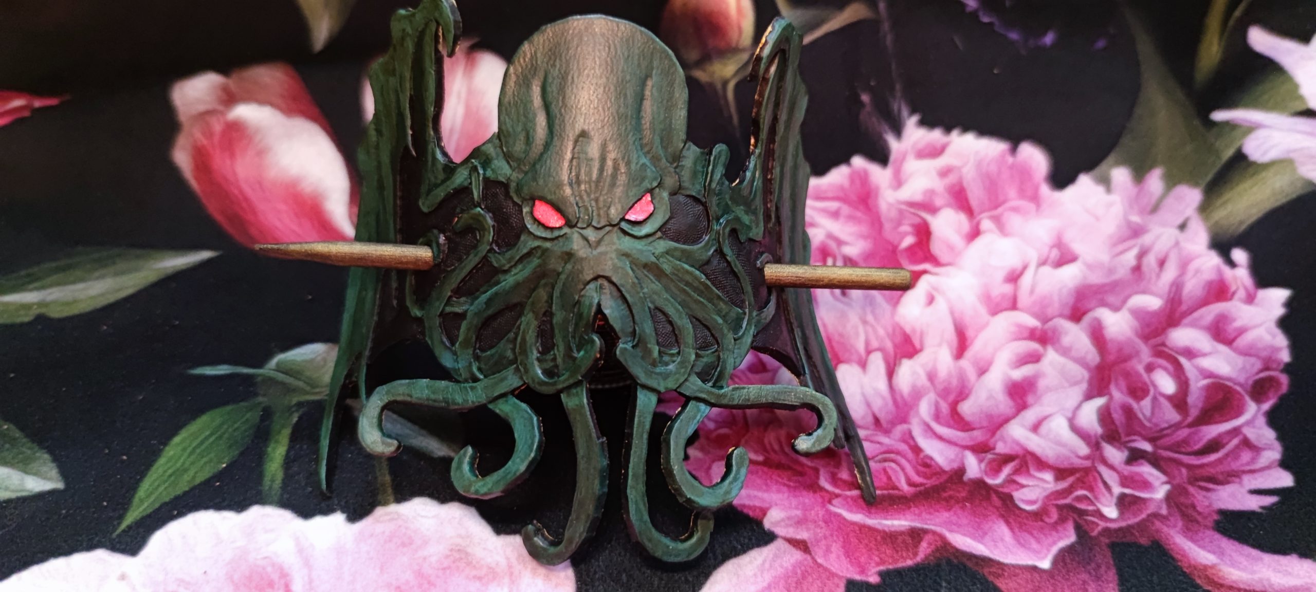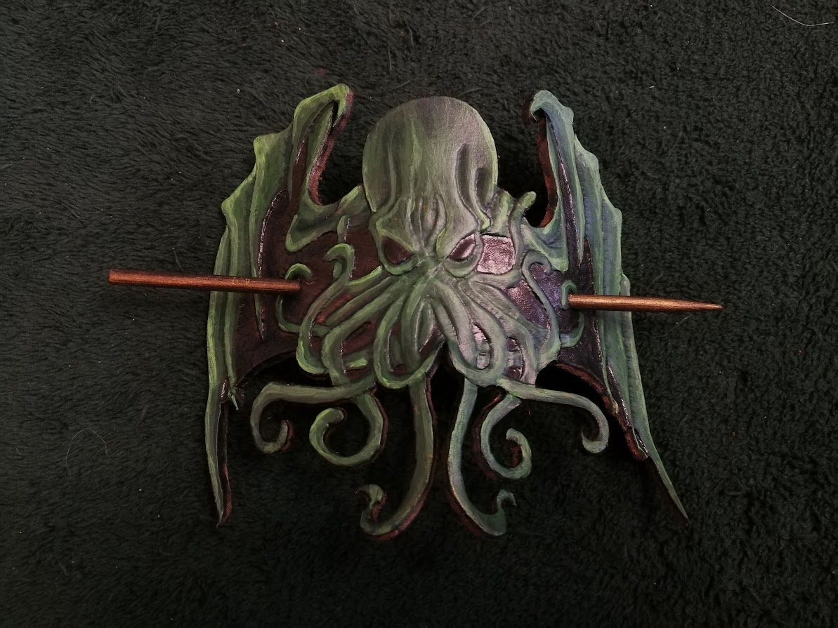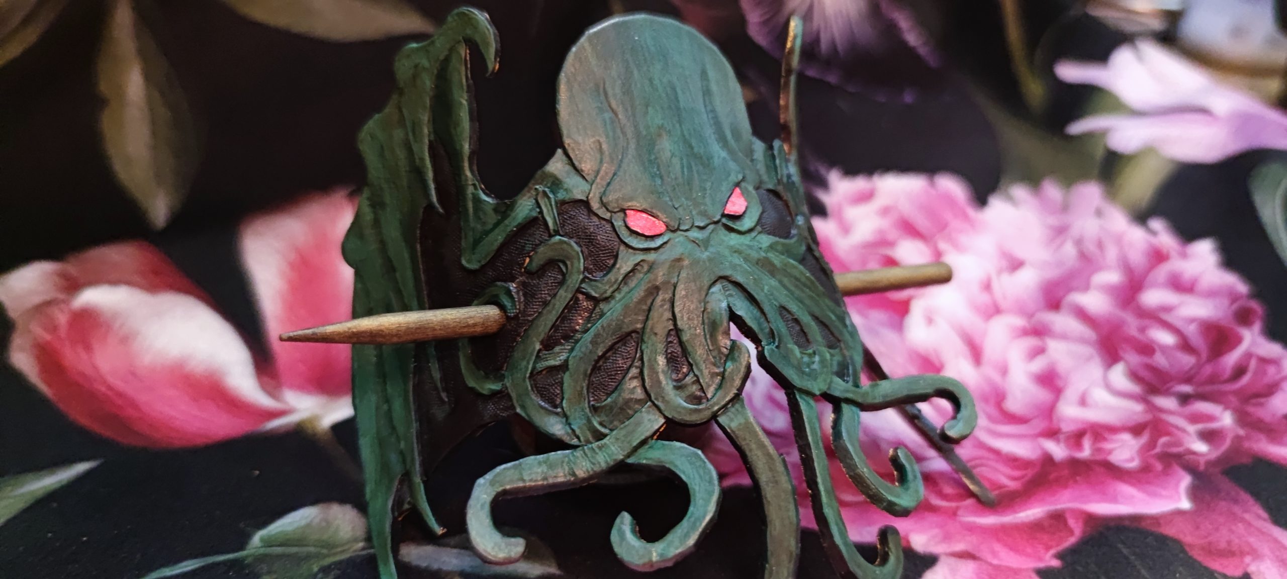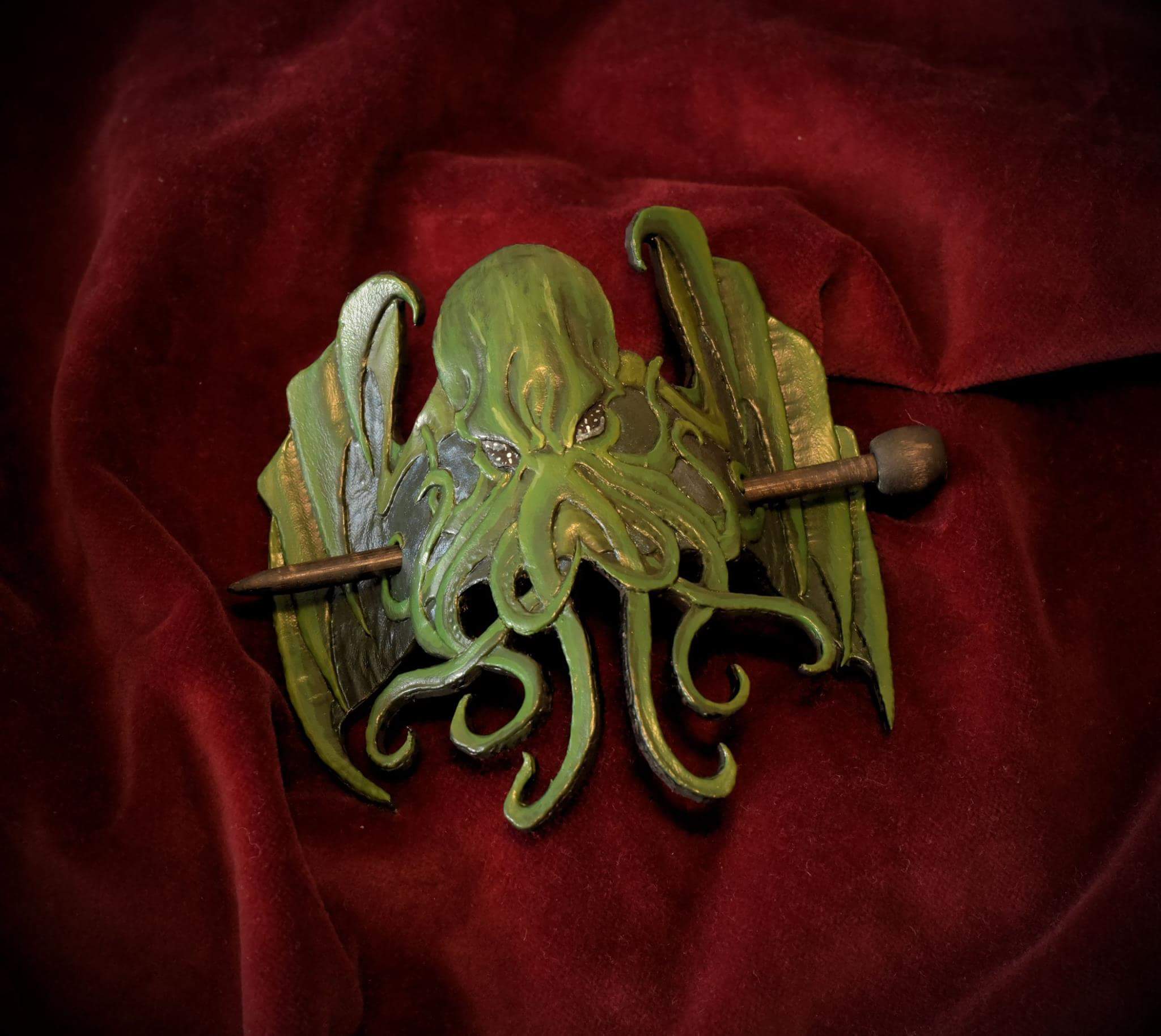 Cthulhu nie jest tylko symbolem; to mistyczna moc, która szepcze z głębin. Nosząc go we włosach, stawiasz znak odwagi wobec tego, co niepoznane, nieokiełznane i wiecznie czające się w cieniu. Spinka przywołuje atmosferę pradawnych oceanów, ciemnych legend i sił, których granice ledwie pojmujemy. Każdy detal — od wijących się macki po subtelne rysy skóry — opowiada historię potęgi, która przetrwała wieki.